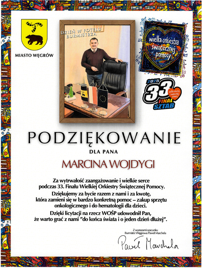 Mamy nadzieję, że „Dzień w fotelu Burmistrza” był dobrą okazją dla Pana Marcina, do zapoznania się z jakimi wyzwaniami spotyka się każdego dnia włodarz miasta oraz pracownicy urzędu. Dziękujemy Panu Marcinowi Wojdydze za wsparcie Wielkiej Orkiestry Świątecznej Pomocy 2025 oraz okazane wielkie serce dla potrzebujących. W przyszłym roku będzie również możliwość wylicytowania „Dnia w fotelu Burmistrza Węgrowa” podczas 34. Finału Wielkiej Orkiestry Świątecznej Pomocy.