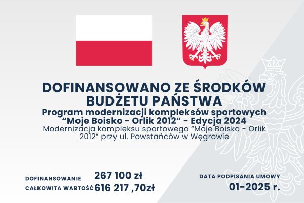 Zadanie inwestycyjne pod nazwą: Modernizacja kompleksu sportowego „Moje Boisko – Orlik 2012” przy ul. Powstańców w Węgrowie zostało dofinansowane ze środków Funduszu Rozwoju Kultury Fizycznej, których dysponentem jest Minister Sportu i Turystyki w ramach Programu modernizacji kompleksów sportowych „Moje Boisko – Orlik 2012” – Edycja 2024.