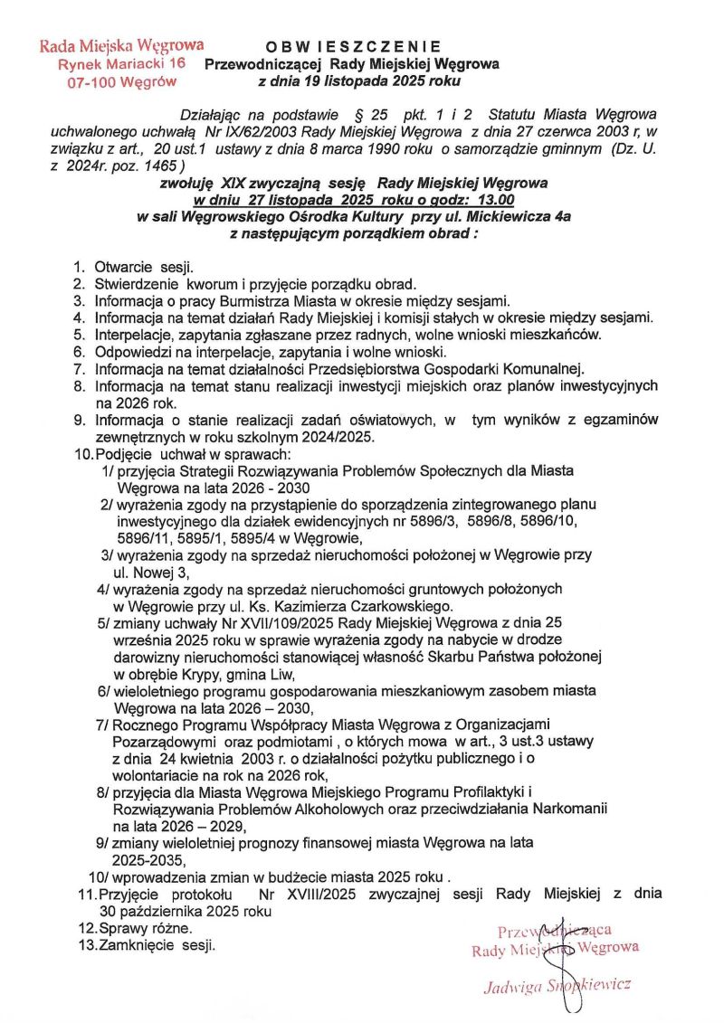 XIX zwyczajna sesja Rady Miejskiej WęgrowaArchiwum